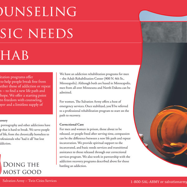 Created for Type and Layout II class. The goal was to create a series of flyers to promote a company, in this case the Salvation Army, to explain and encourage people to seek our their services. The way I created these flyers was so they would interlock with each other, showing the Salvation Army shield motif, while displaying the three most important services at the top.